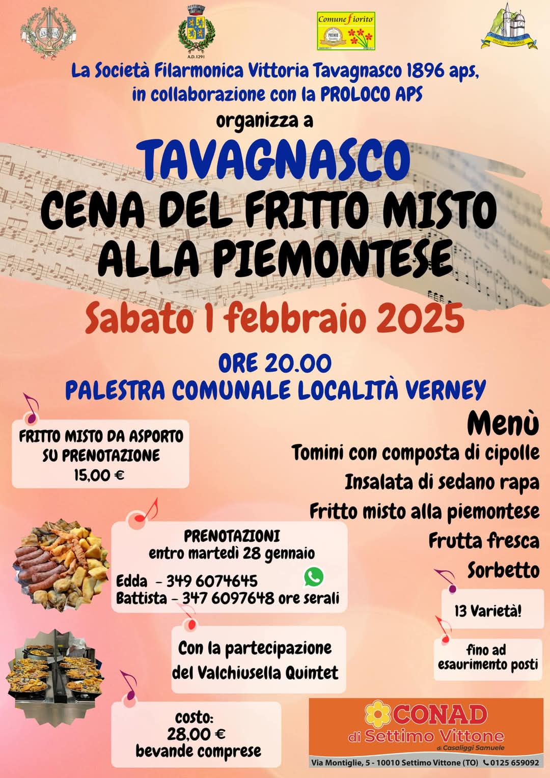 La Società Filarmonica Vittoria 1896 aps in collaborazione con la PRO LOCO APS organizzano IL FRITTO MISTO ALLA PIEMONTESE- Presso la Palestra Comunale.